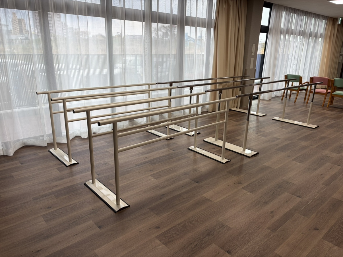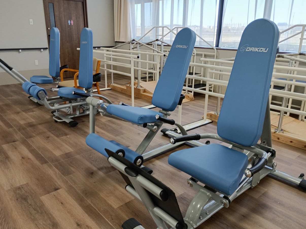 油圧マシーン(レッグカール、チェストプレス、レッグプレス、ヒップアブダクション)に加え、ニューステップ、平行棒など、歩く力を強化する機器を多く導入しています。